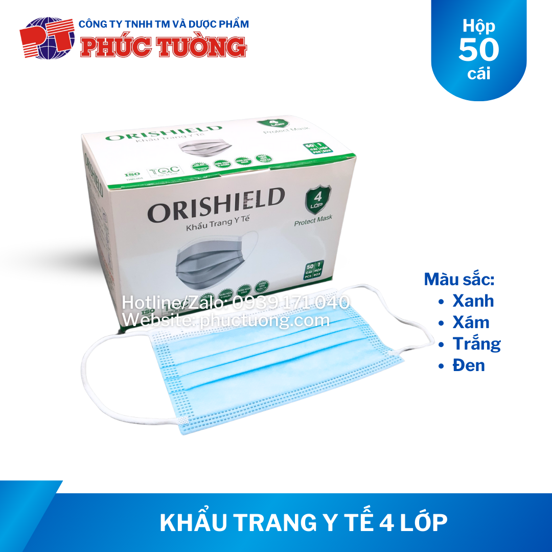 QUY CÁCH Khẩu trang y tế 4 lớp Orishield: Hộp 50 cái (10 cái/gói) màu xanh dương, xám, trắng, đen