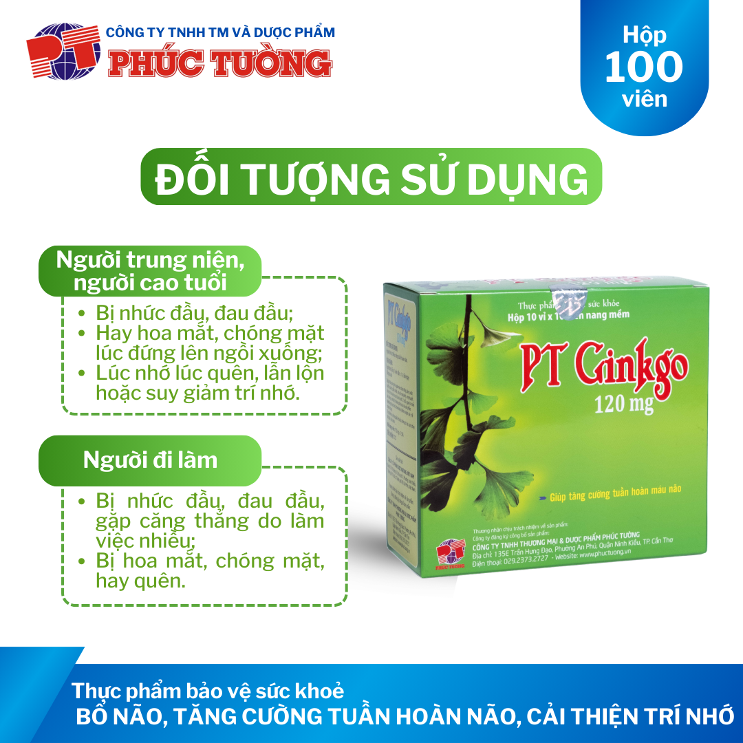 ĐỐI TƯỢNG SỬ DỤNG PT Ginkgo: Người bị thiểu năng tuần hoàn não (lượng máu lên não bị giảm) với biểu hiện: hoa mắt, chóng mặt, đau đầu, rối loạn tiền đình do ứ trệ tuần hoàn, suy giảm trí nhớ.