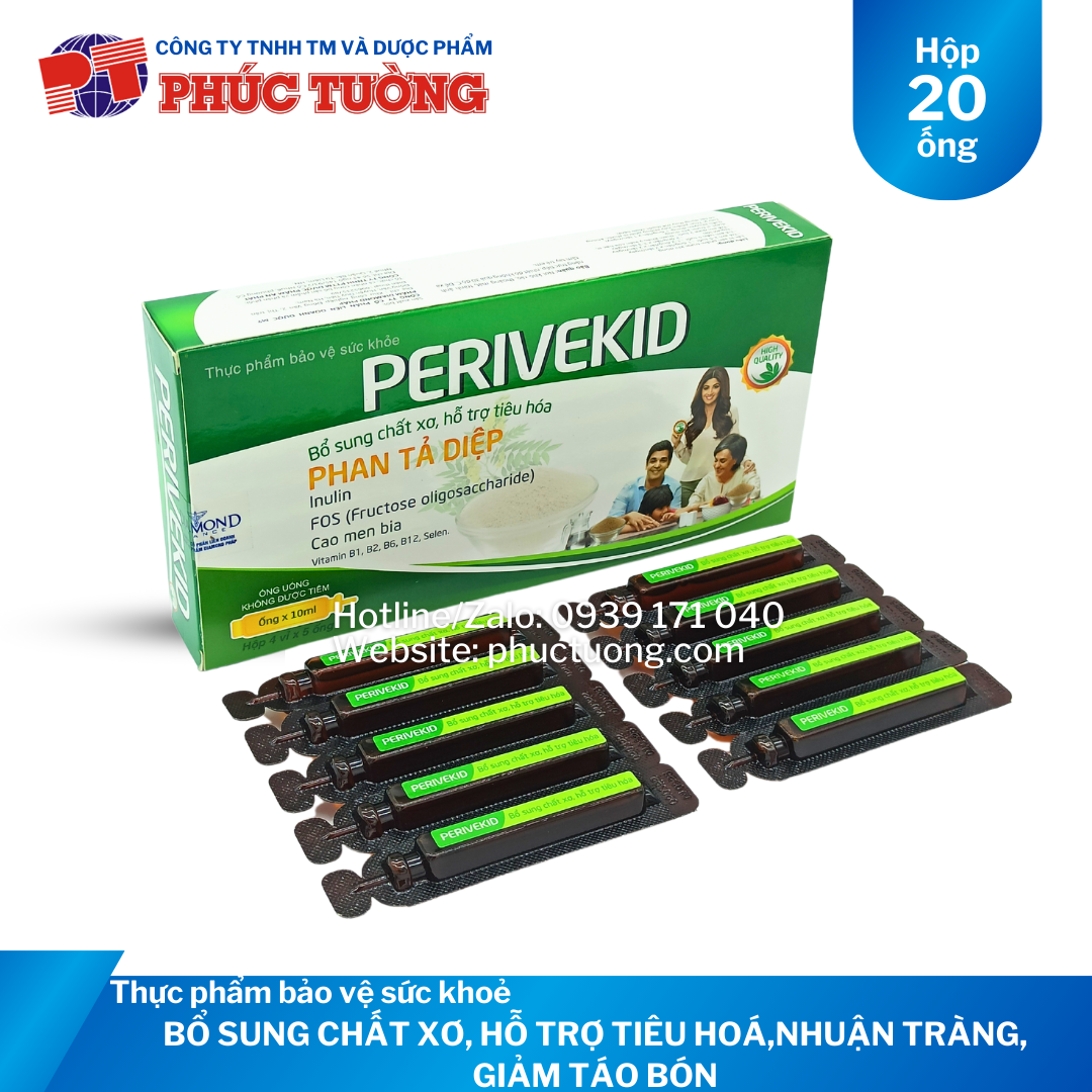 CÔNG DỤNG Perivekid: Bổ sung chất xơ, phan tả diệp hỗ trợ tiêu hoá, hỗ trợ làm giảm các triệu chứng táo bón, phân sống, đầy hơi, chướng bụng, ăn không tiêu.