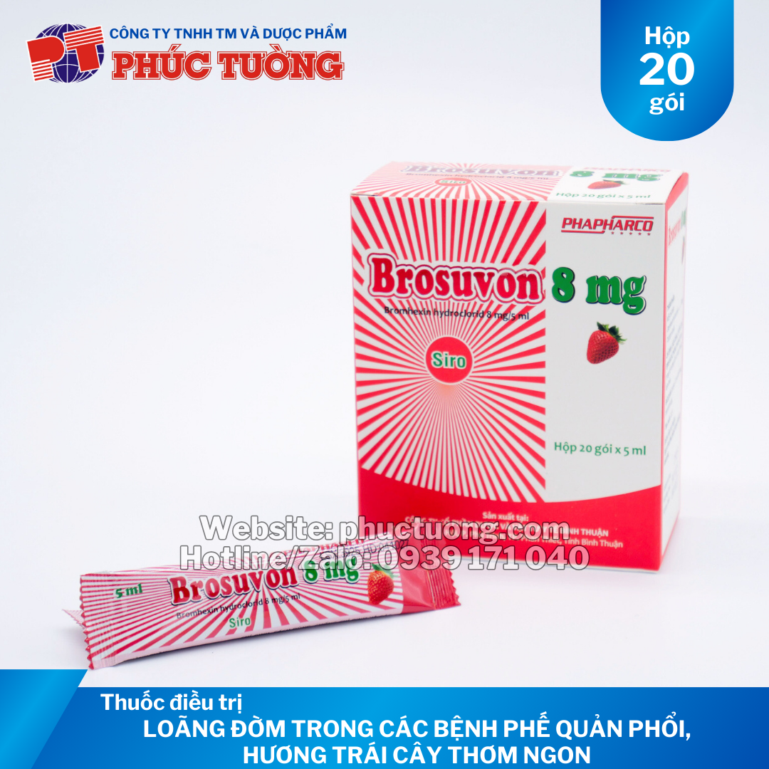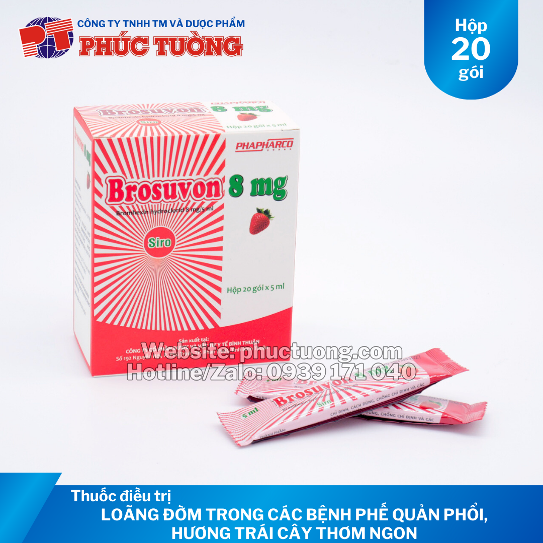 THÀNH PHẦN Brosuvon 8mg: Mỗi 5ml chứa: Bromhexin hydroclorid 8 mg (hương trái cây)