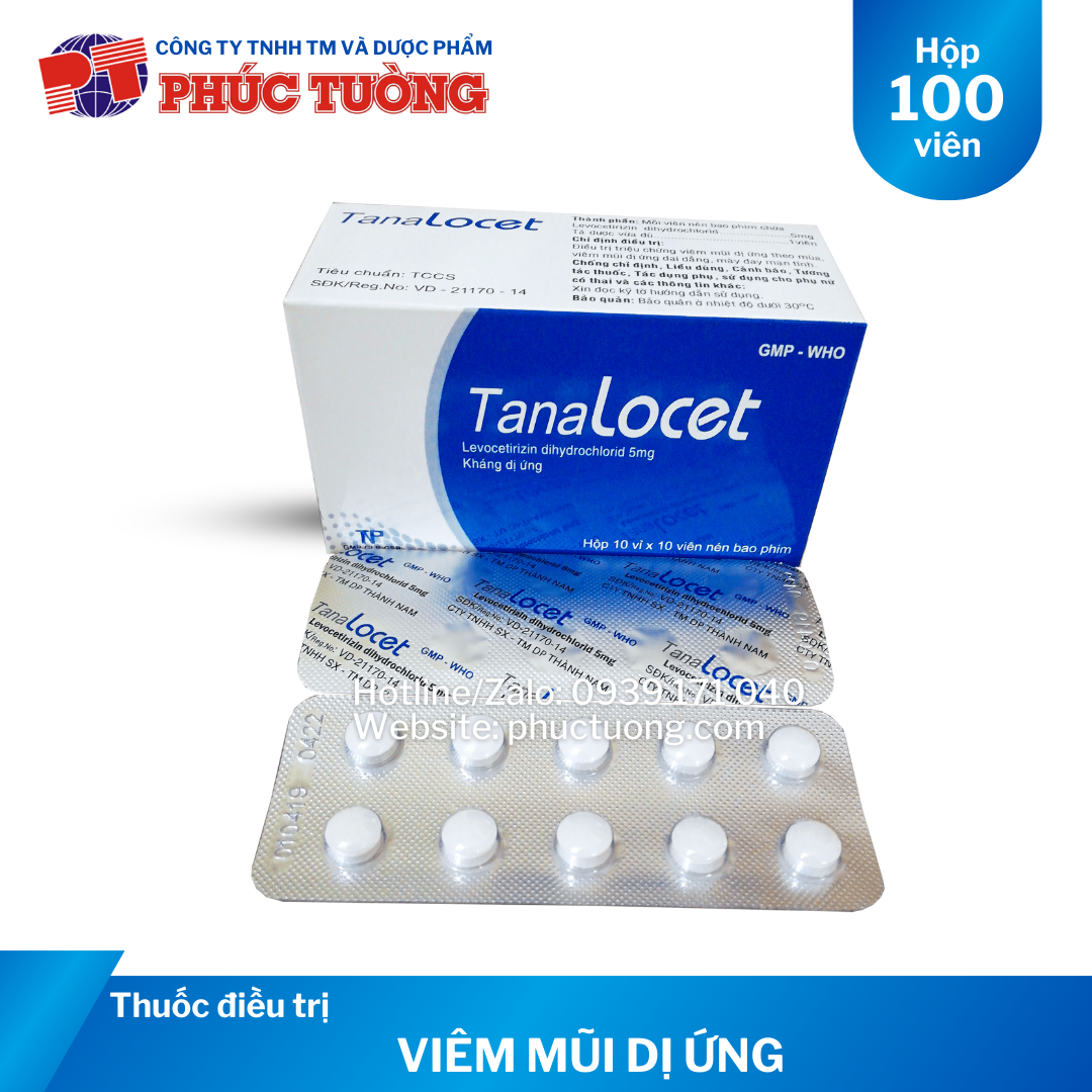 CHỈ ĐỊNH Tanalocet: Điều trị các trường hợp dị ứng: viêm mũi dị ứng theo mùa, viêm mũi dị ứng mạn tính, hắt hơi, chảy nước mũi, ngứa mũi, chảy nước mắt, mắt đỏ, mề đay mạn tính.