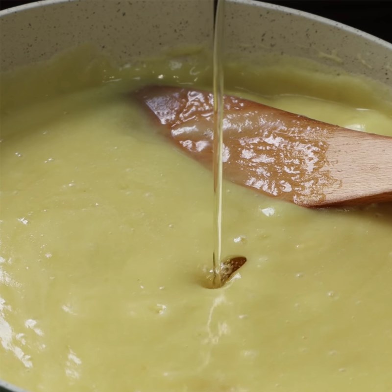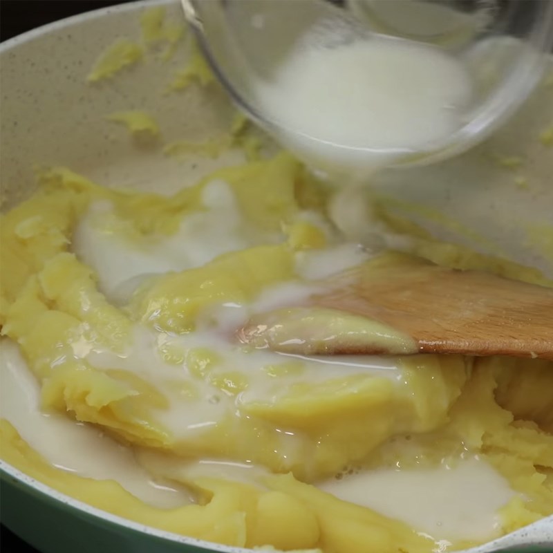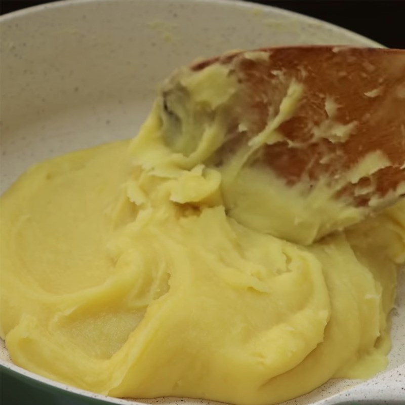 - Hòa tan 1.5 muỗng canh bột mì cùng 3 muỗng canh nước. Cho từ từ hỗn hợp bột vào chảo rồi tiếp tục sên đến khi nhân tạo thành khối dẻo mịn, không dính chảo và không bị chảy xệ là được.